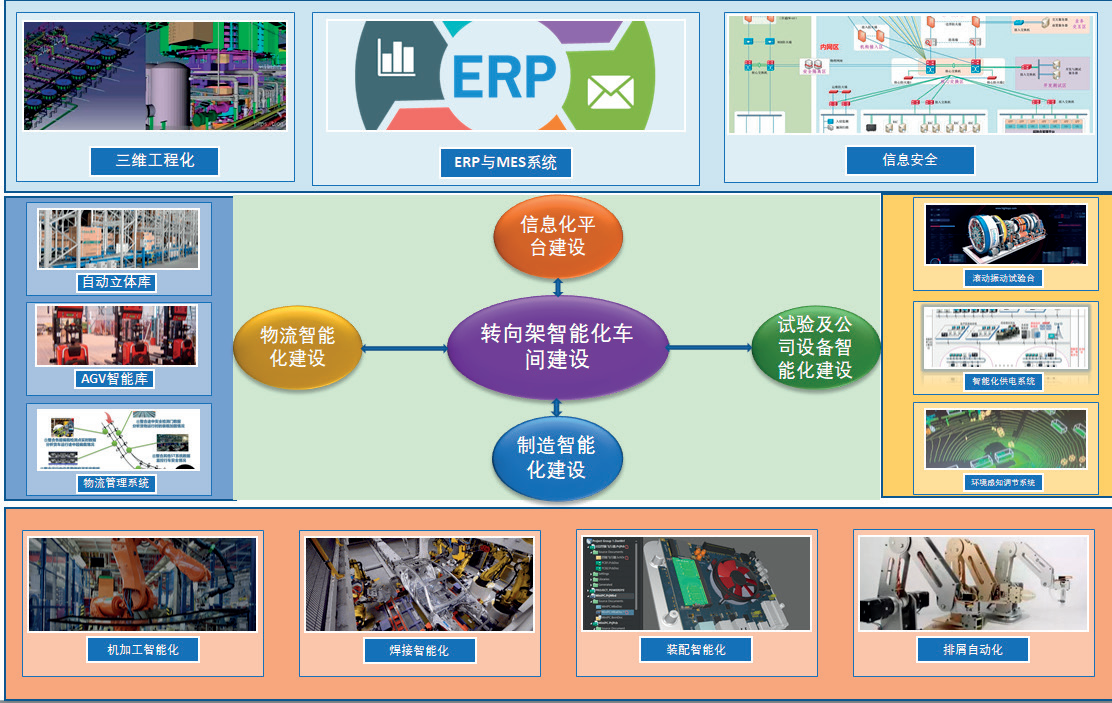 轉(zhuǎn)向架智能化車間信息化平臺建設,需要以信息化平臺為基礎,擴展數(shù)字化設計、工藝、制造一體化平臺,深化三維工程化應用; 建立 MES 系統(tǒng),打通 MES 與 ERP、三維工程化數(shù)據(jù)連接,要求實現(xiàn)智能化制造;引入智能化立體倉庫、倉儲管理系統(tǒng)(WMS)、AGV 小車控制系統(tǒng)與物流仿真系統(tǒng)等現(xiàn)代化物流手段, 實現(xiàn)智能化物流;增加在線檢測和過程質(zhì)量控制系統(tǒng),提升產(chǎn)品質(zhì)量控制手段。